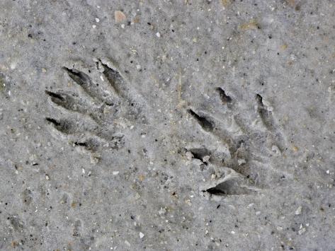 Anyway, when we woke up, I told Lilly all about the dog food bin incident. She got out of bed and looked out the window to see the upside-down bin. I got up and let the dogs outside, and they immediately ran over to the dog food bin and began intensely sniffing it, and sniffing the ground all around it. I followed them outside so I could feed them and finally closely investigate the bin for myself. I looked at the soft, muddy ground for any tracks, but didn't really see any (plus the dogs had already tracked it up with their own footprints anyway). I looked at the bin itself to see if it had any muddy "handprints" on it (raccoon prints look a little like human handprints because they have little fingers like this):